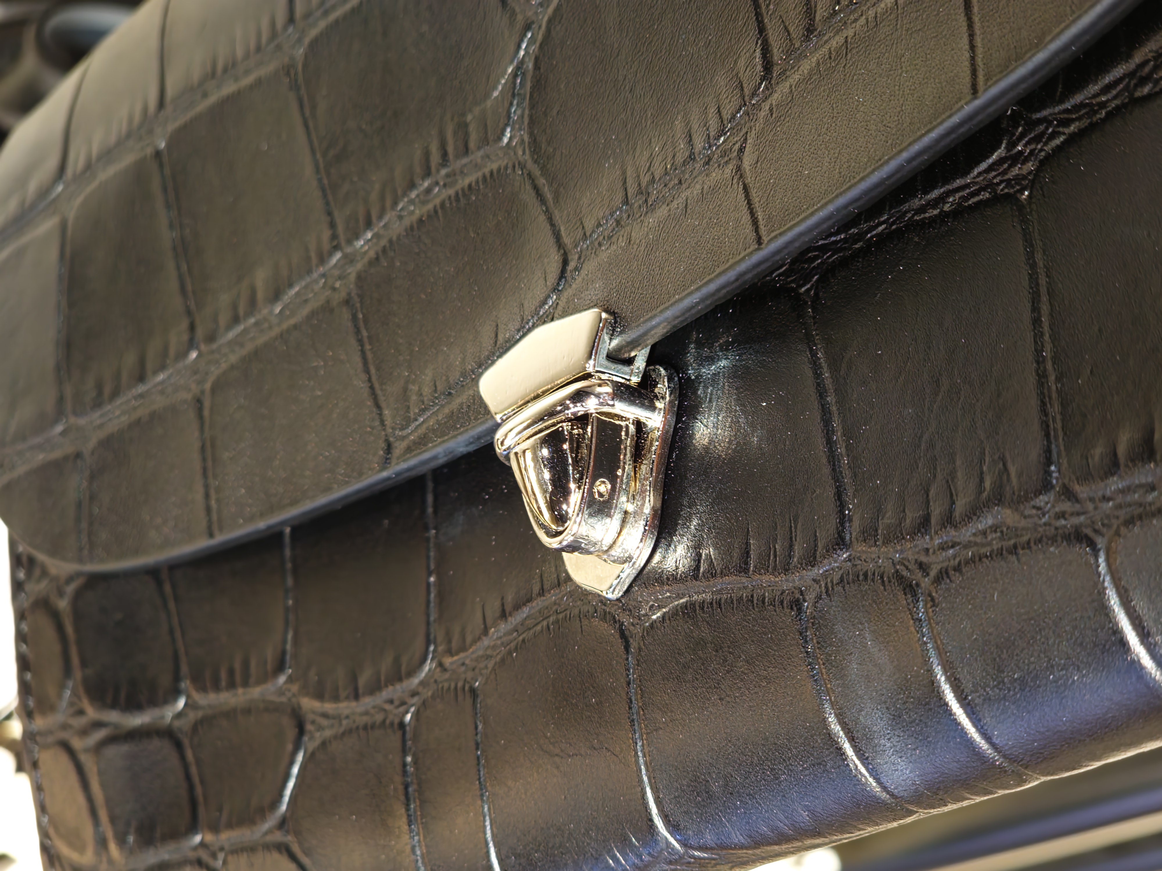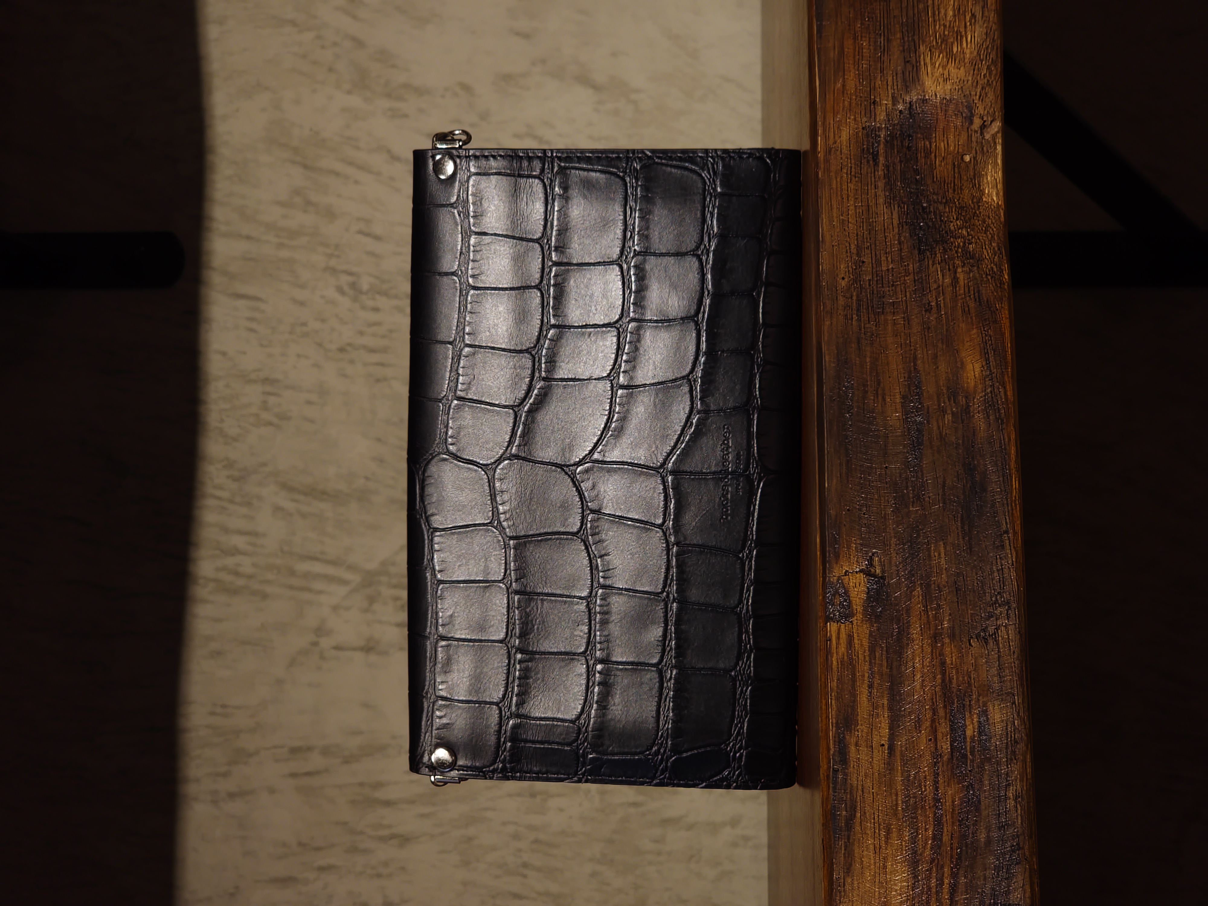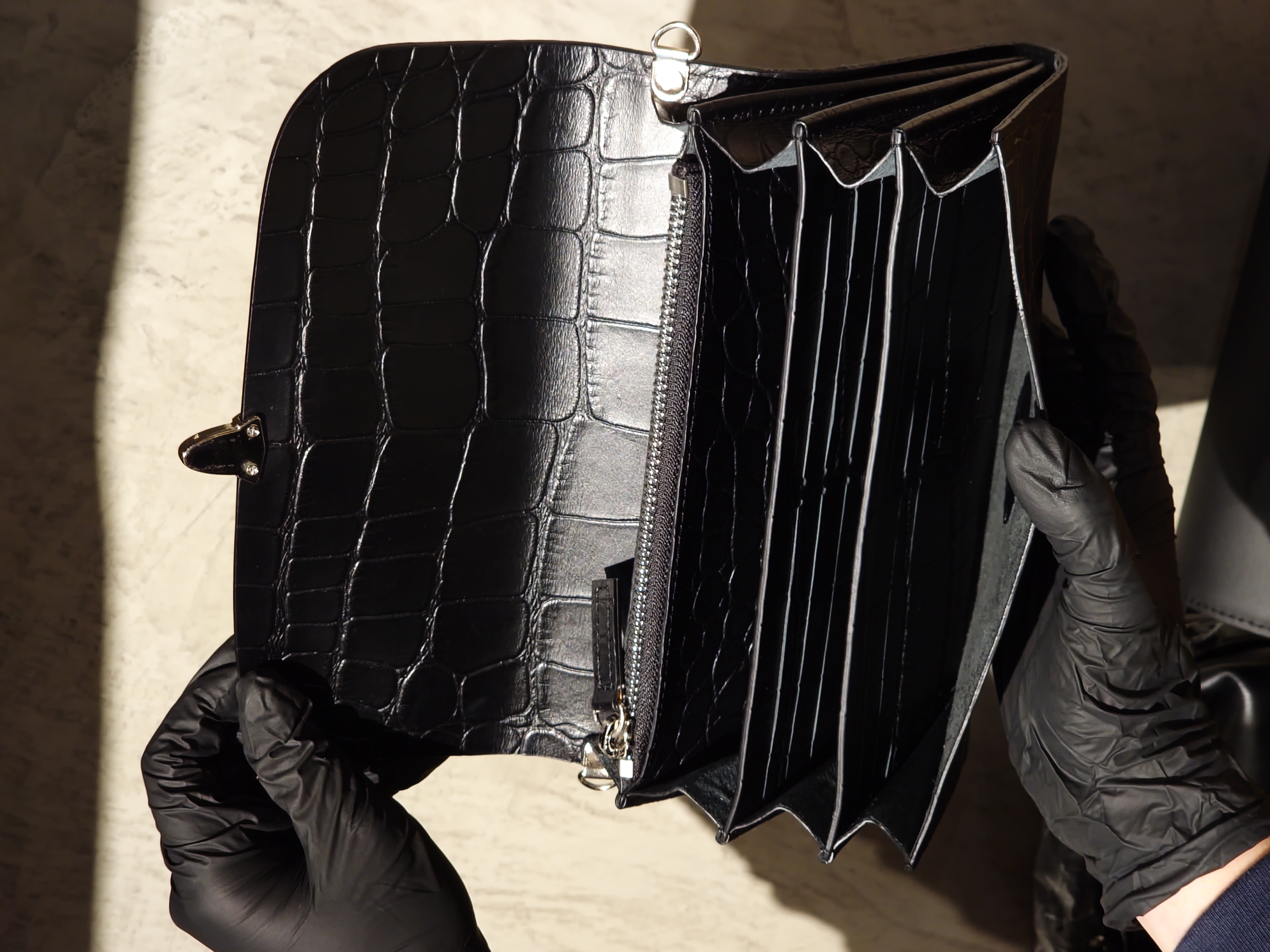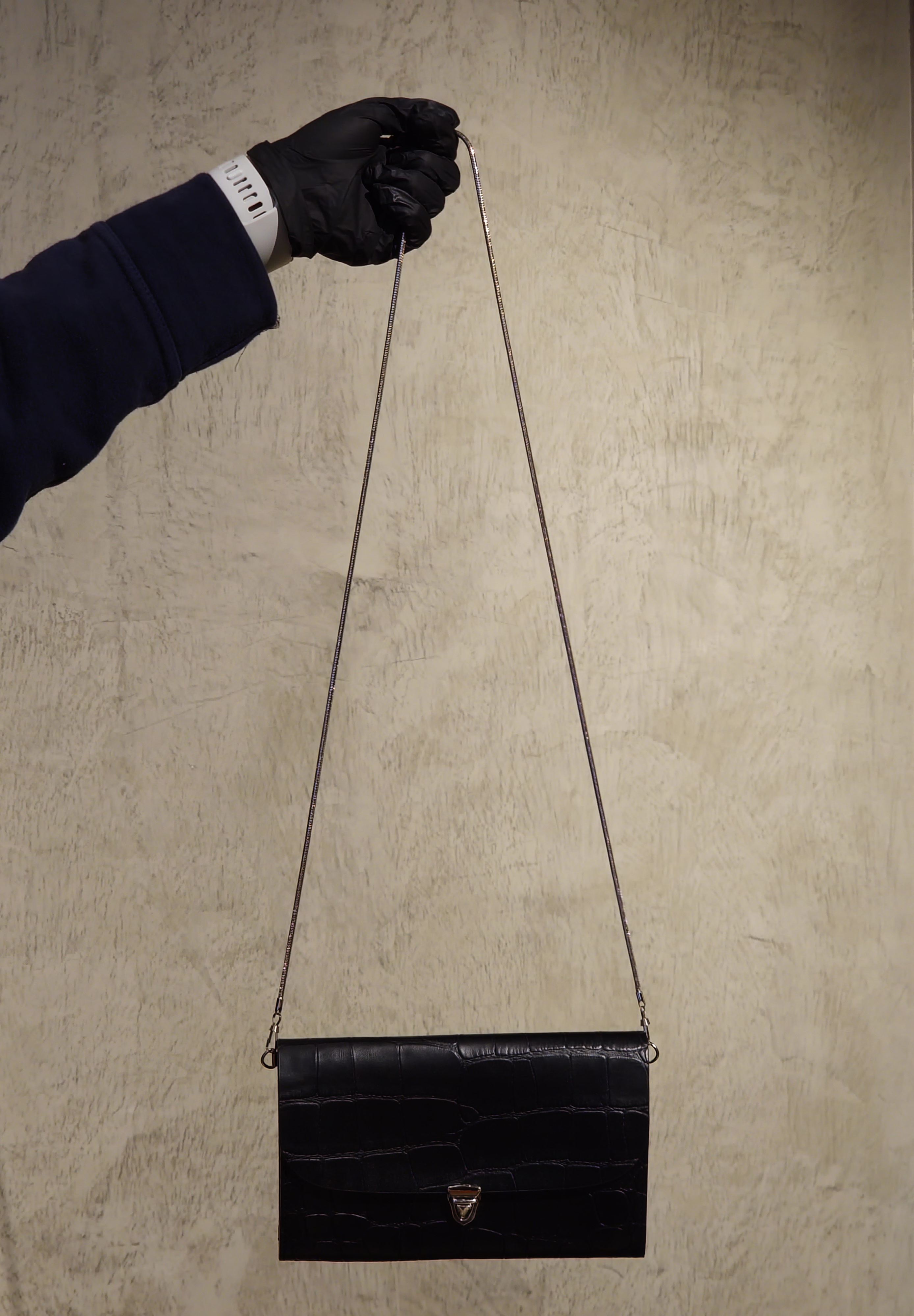Bucks & Leather A structured long wallet crafted from Italian cowhide with an embossed crocodile skin texture. Designed with five compartments — including four open slots and one zip pocket — this wallet offers ample space for bills, cards, coins, and even a smartphone. Its silver-tone push-lock closure adds a refined finishing touch, making it ideal for both daily use and evening occasions. Dimensions & Details • Material: Italian Cowhide • Bag Size: H12.5 cm × W20 cm × D2.5 cm • Strap: • Metal chain edge-to-edge length — 104.5 cm (non-adjustable) Note: Each piece is measured manually; slight variations may occur.